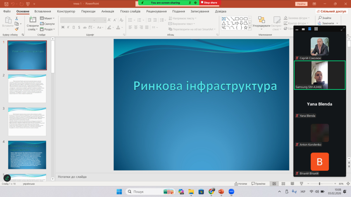 Під час заняття було детально розглянуто ключові елементи ринкової інфраструктури аграрного сектору, зокрема систему торговельних мереж, логістичні центри, біржову торгівлю, складське господарство та транспортне забезпечення. Особлива увага приділялася ролі інфраструктури у формуванні ефективних ланцюгів постачання сільськогосподарської продукції.