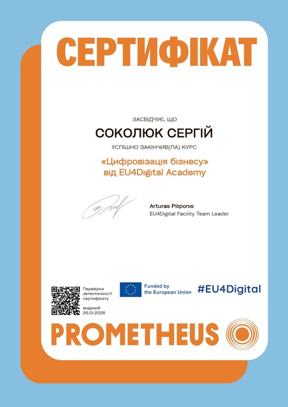 Зокрема, Сергій СОКОЛЮК отримав сертифікат «Цифровізація бізнесу» від EU4Digital Academy. Цей практико-орієнтований онлайн-курс, розроблений командою Ernst & Young Academy of Business, надає сучасні знання та інструменти для системного впровадження цифрових рішень у бізнес-процеси. Він спрямований на формування у керівників та підприємців здатності ефективно адаптуватися до викликів цифрової економіки.