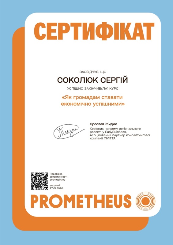 Раніше він також успішно завершив курс «Як громадам ставати економічно успішними», розроблений за участі експертів EasyBusiness та CIVITTA. Програма фокусується на практичних аспектах проєктного менеджменту, стратегічного планування та залучення ресурсів для стимулювання соціально-економічного розвитку територіальних громад.
