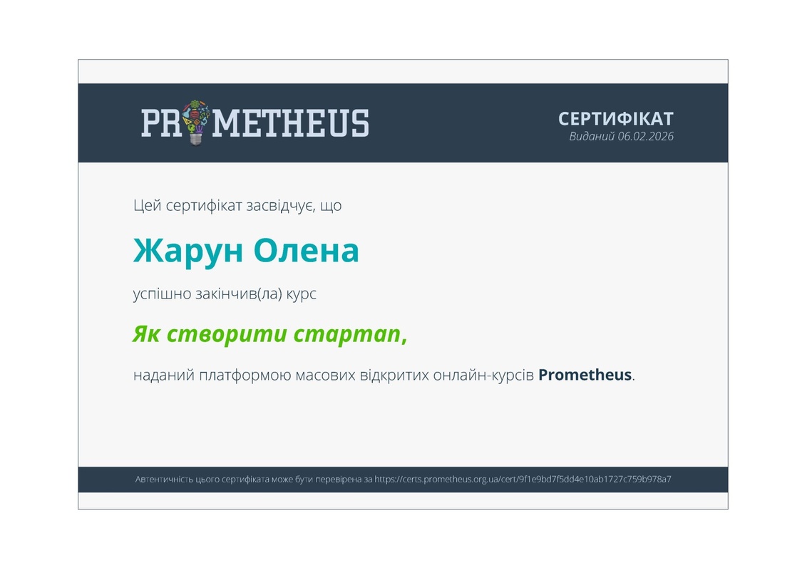 Доцент кафедри ЖАРУН Олена успішно завершила два онлайн-курси «Наукова комунікація в цифрову епоху» та «Як створити стартап» на платформі Prometheus. Отримані сертифікати засвідчують прагнення до постійного професійного зростання та впровадження сучасних підходів в освітній і науковій діяльності.