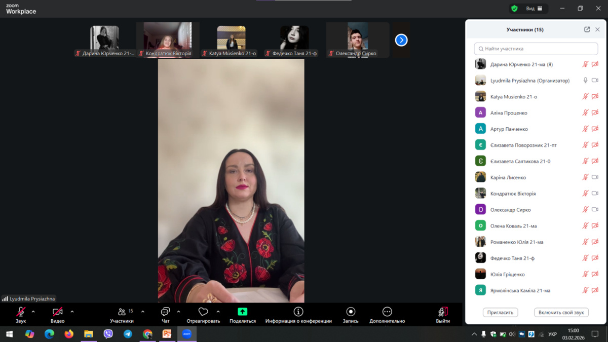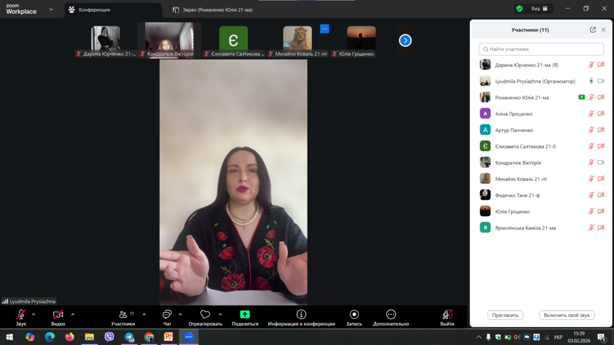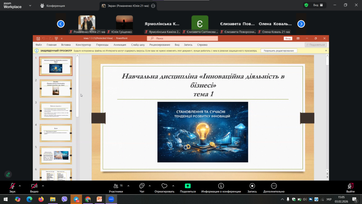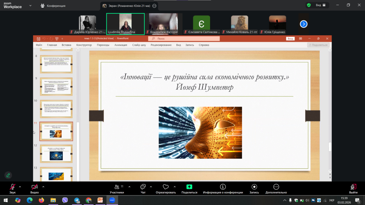 3 лютого 2026 року для здобувачів вищої освіти факультету економіки і підприємництва УНУ груп Б2 о, ф, ма, пт, сз, було проведено он-лайн лекційне заняття з дисципліни «Інноваційна діяльність в бізнесі» за допомогою платформи Zoom, старшим викладачем кафедри підприємництва та бізнес-технолгій Людмилою Володимирівною ПРИСЯЖНОЮ. Тема заняття була дуже цікава, захоплююча та пізнавальна «Становлення та сучасні тенденції розвитку інновацій». Он-лайн лекцію супроводжував влучно підібраний різноманітний презентаційний матеріал, який включав матеріали із зазначеної тематики, що дозволило лекторові застосовувати прийоми розповіді. характеристики, пояснення, коментування і зберегти стійку увагу слухачів протягом всього заняття. Окрім того, викладач постійно залучала здобувачів вищої освіти до активної участі у занятті, використовуючи сучасні методичні прийоми та заохочувальні стимули. Лекція мала характерний високий науковий рівень викладеної інформації, яка має світоглядне значення, охоплювала значний обсяг систематизованої й методично опрацьованої сучасної наукової інформації.