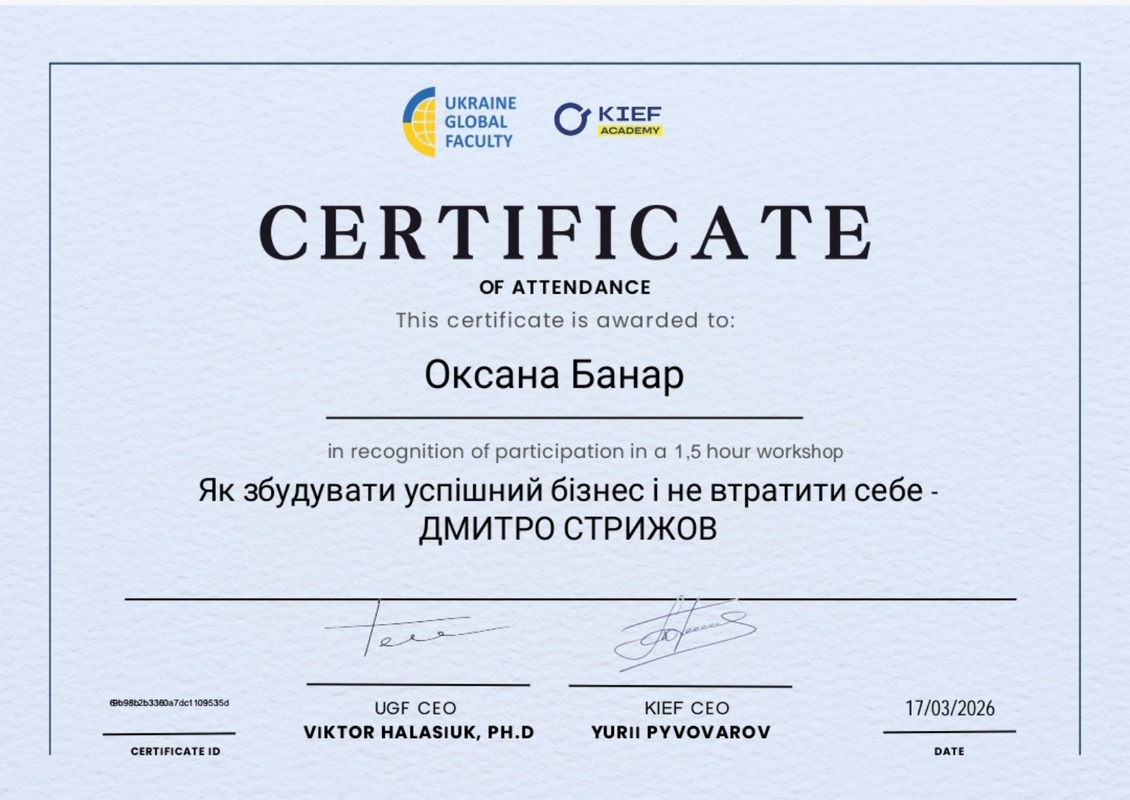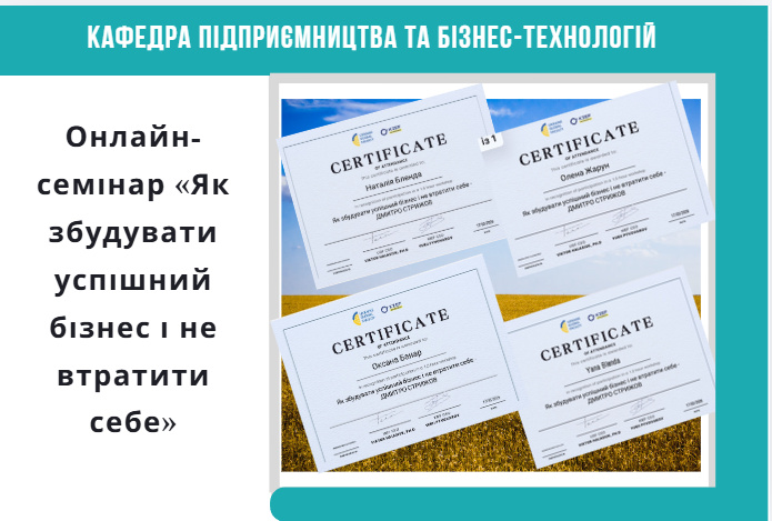 17 березня 2026 року професор кафедри підприємництва та бізнес-технологій Оксана БАНАР, доценти кафедри підприємництва та бізнес-технологій Олена ЖАРУН і Наталія БЛЕНДА та здобувач другого (магістерського) рівня освіти спеціальності «Торгівля» Яна БЛЕНДА взяли участь в онлайн-семінарі «Як збудувати успішний бізнес і не втратити себе», що відбувся на міжнародній освітній платформі Ukraine Global Faculty. Спікером заходу став засновник холдингу SHERIFF - Дмитро СТРИЖОВ.