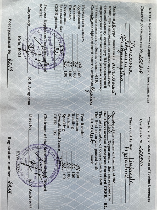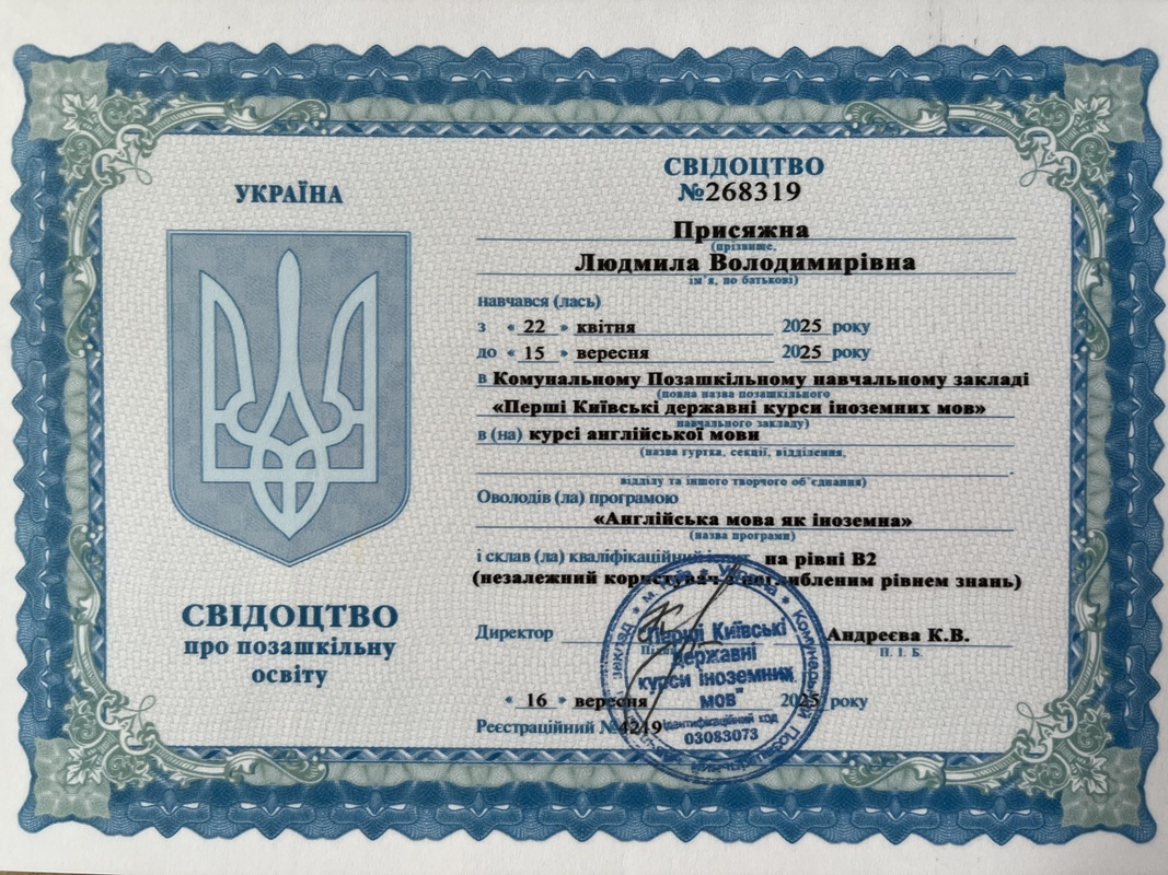 У період з 22 квітня по 15 вересня 2025 року старший викладач кафедри підприємництва та бізнес-технологій Людмила ПРИСЯЖНА навчалась в Комунальному навчальному закладі «Перші Київські державні курси іноземних мов» на курсі англійської мови та успішно оволоділа програмою «Англійська мова як іноземна». Загальна кількість учбових годин – 620. Закінчила курс навчання з англійської мови, що відповідає загальноприйнятому європейському стандарту В2 ( незалежний користувач з поглибленим рівнем знань) та склала кваліфікаційний іспит з оцінкою відмінно загальний бал 375 CEFR B2.