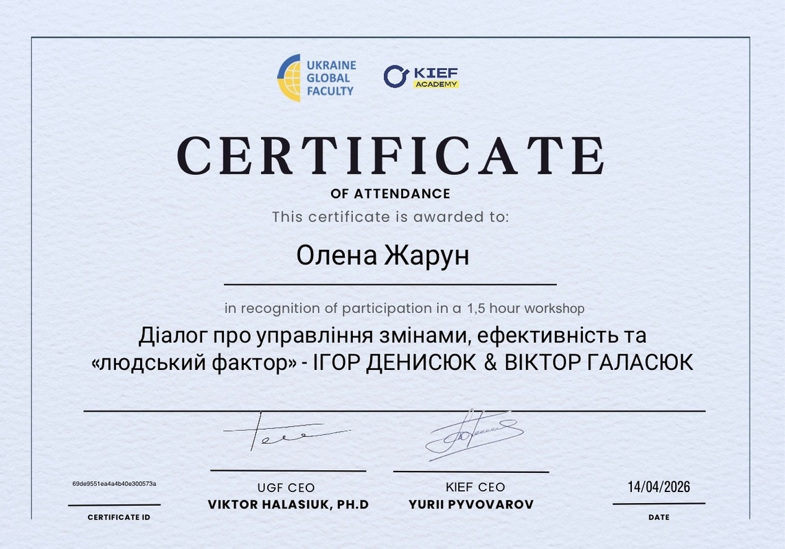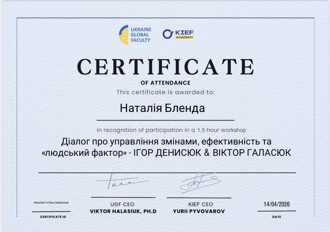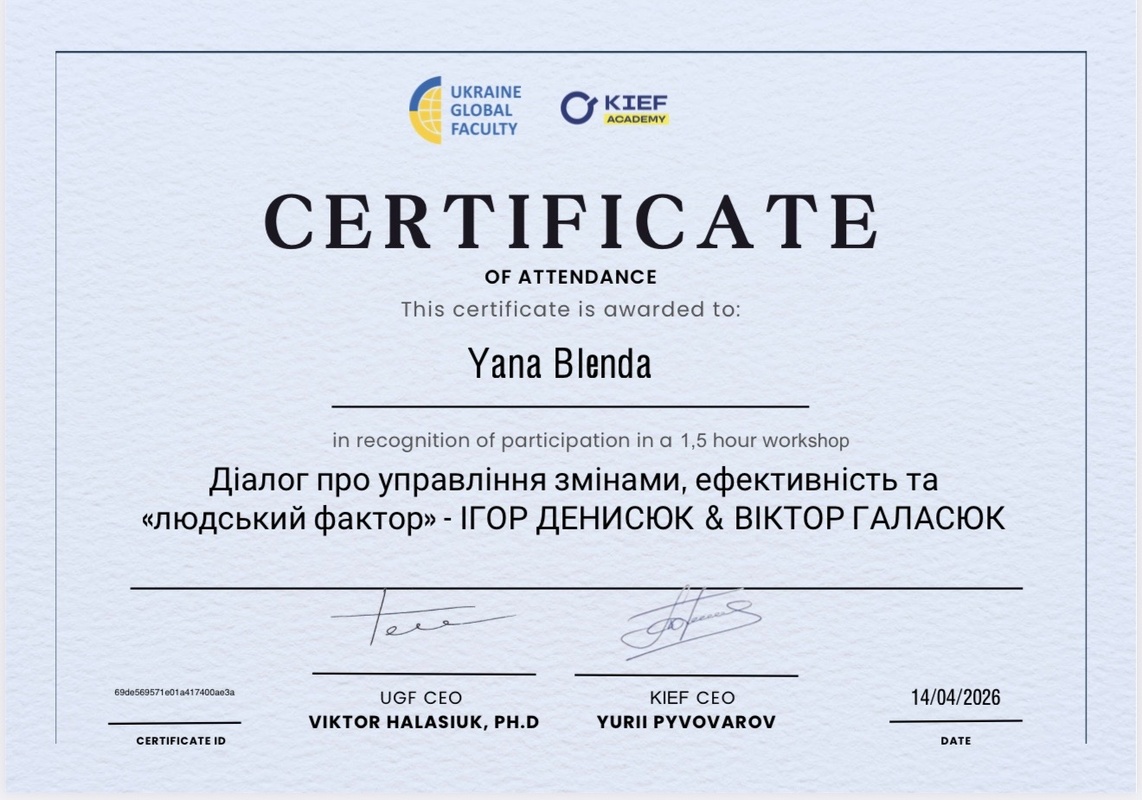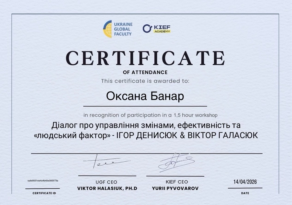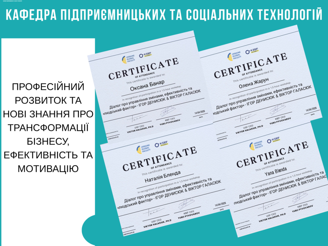 Професор кафедри підприємницьких та соціальних технологій Оксана БАНАР, доценти Олена ЖАРУН і Наталія БЛЕНДА та здобувач другого (магістерського) рівня освіти спеціальності «Торгівля» Яна БЛЕНДА 14.04.2026р. долучилися до онлайн-семінару: «Діалог про управління змінами, ефективність та «людський фактор», організованого спільнотою UGF.