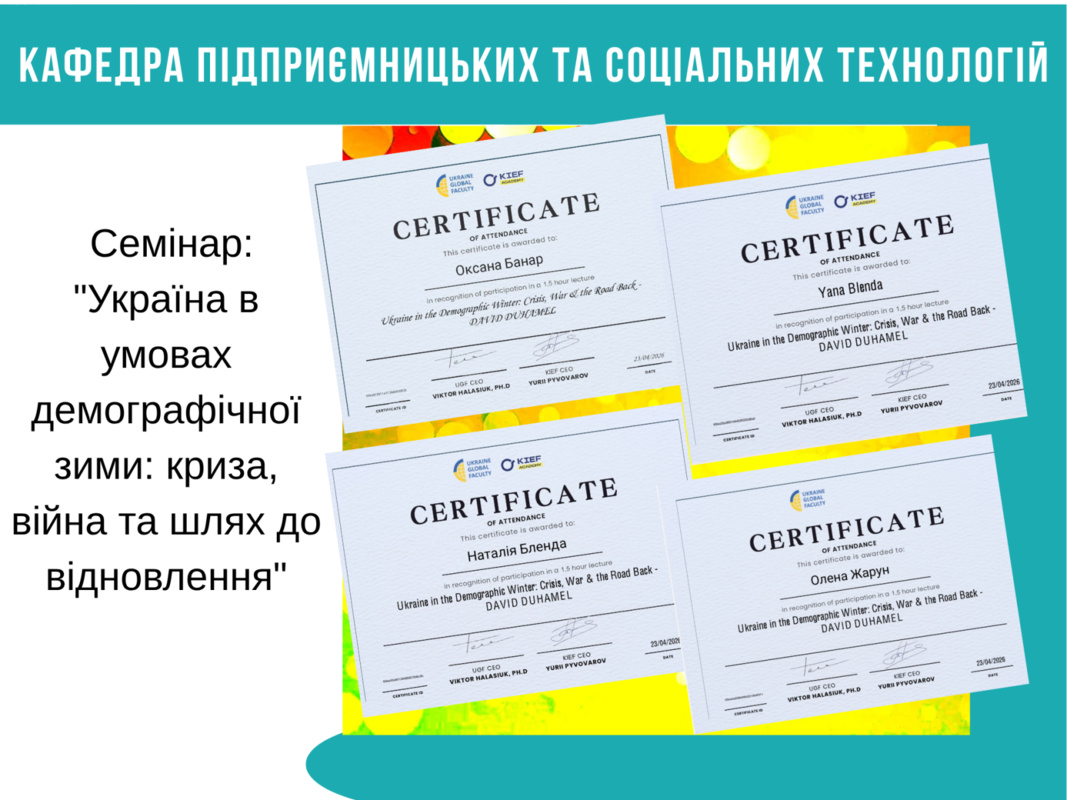 Професор кафедри підприємницьких та соціальних технологій Оксана БАНАР, доценти Олена ЖАРУН і Наталія БЛЕНДА та здобувач другого (магістерського) рівня освіти спеціальності «Торгівля» Яна БЛЕНДА долучилися до науково-освітнього семінару на тему демографічних викликів сучасної України, спікером якого став Давід Дюамель — професор економіки Parsons Paris та Sciences Po Paris.