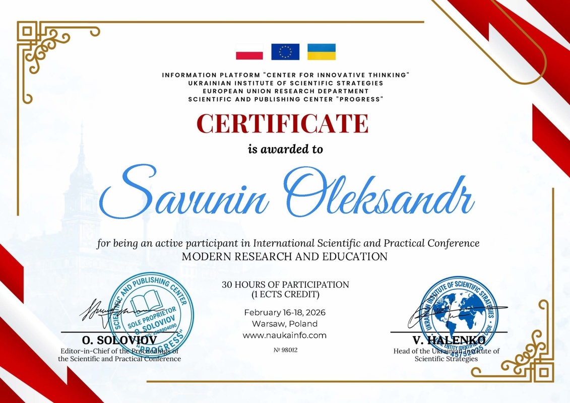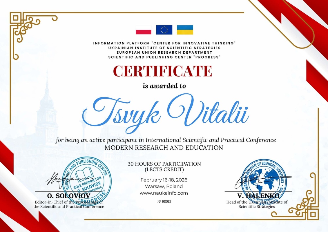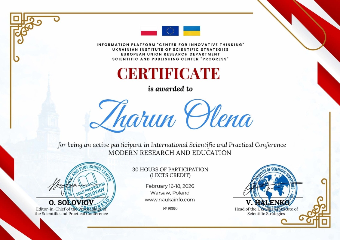 Доцент кафедри підприємництва та бізнес-технологій Олена ЖАРУН разом із здобувачами третього (освітньо-наукового) рівня взяла участь у міжнародному науково-освітньому заході «Modern Research and Education», що відбувся 16–18 лютого 2026 року у Варшаві. Захід проходив в онлайн-форматі, що дало можливість долучитися до міжнародної академічної дискусії незалежно від географічних кордонів та забезпечило активну комунікацію з науковцями і освітянами з різних країн світу.