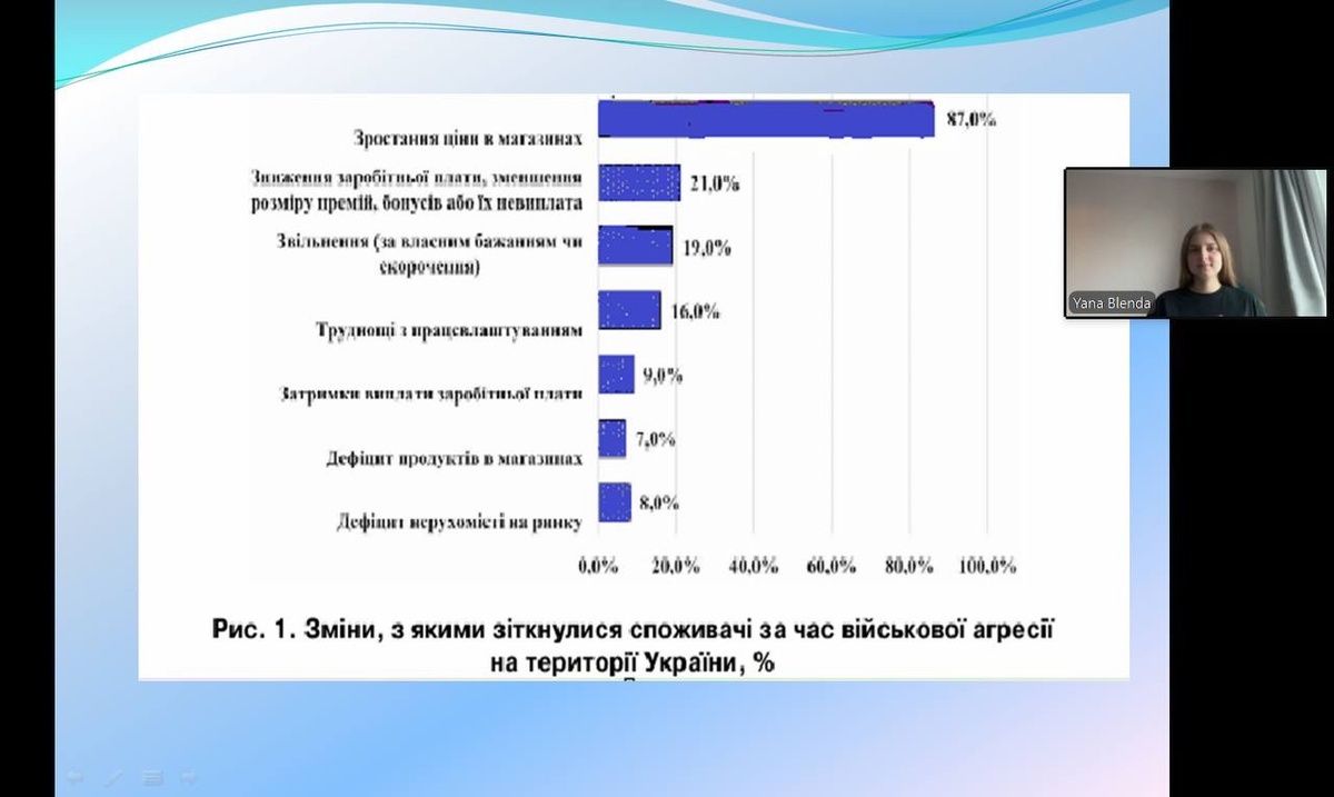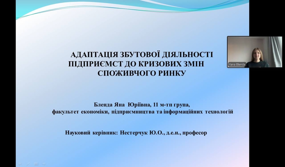 Яна БЛЕНДА (11м-тп). Тема: «Адаптація збутової діяльності підприємств до кризових змін споживчого ринку» (науковий керівник – д.е.н., проф. Юлія НЕСТЕРЧУК).